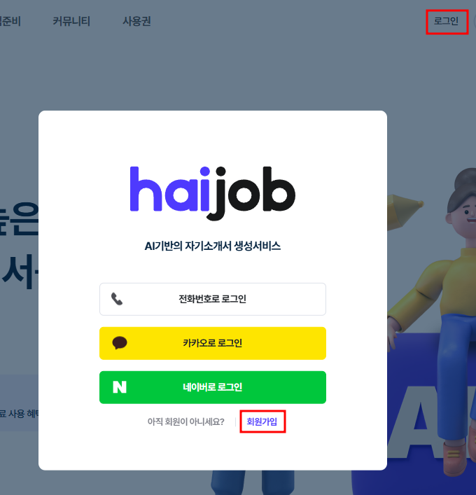1️⃣ 하이잡 사이트 접속 후 회원가입 및 로그인을 진행합니다. (▶▶하이잡 바로가기)