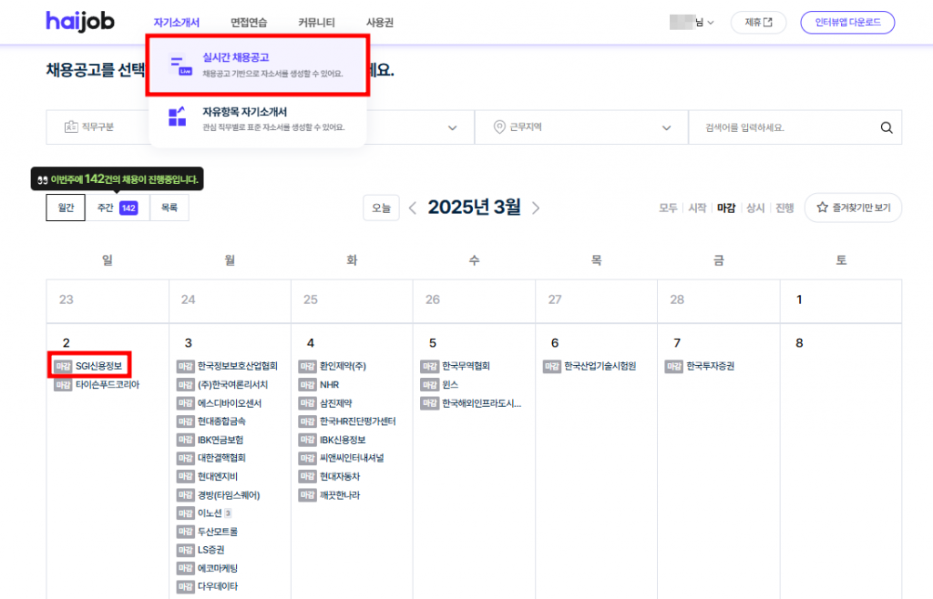 3️⃣ [실시간 채용공고] 메뉴 채용달력에서 'SGI신용정보'를 선택합니다.(달력03/02) (▶▶채용공고 바로가기)