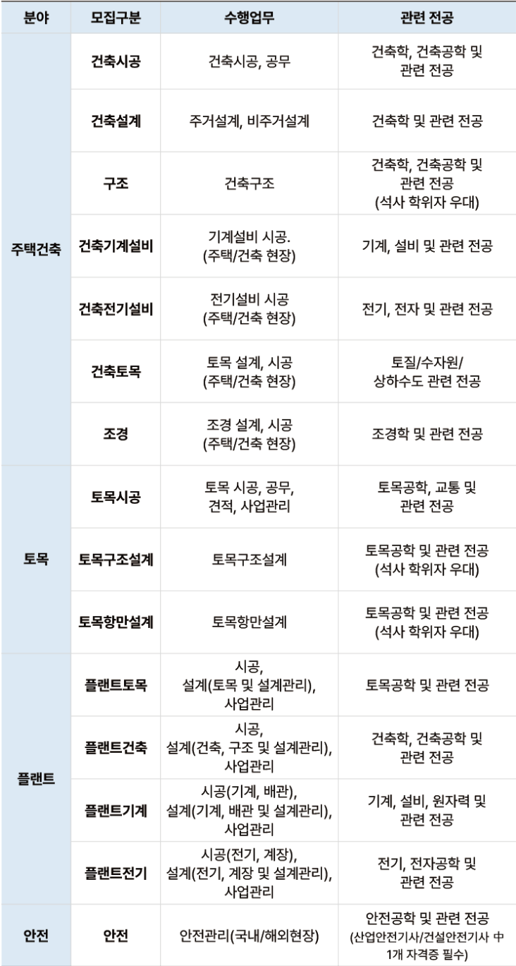 국내외 다양한 프로젝트를 수행하며 건설 산업을 선도하고 있는 대우건설은 주택, 토목, 플랜트 등 여러 분야에서 성장 기회를 제공합니다.