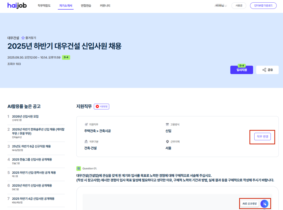 하이잡을 활용해 자소서 초안을 빠르게 잡고, 소제목 생성, AI 첨삭 기능으로 완성도를 높이세요!