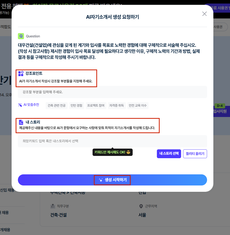 대우건설 자소서 항목에 맞게, 내 경험 스토리를 설득력 있게 연결한 맞춤형 자소서를 만들어 줍니다.