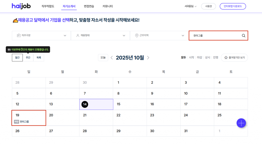 2️⃣'자기소개서 > 실시간 채용공고' 메뉴의 채용공고 달력에서 '한미그룹(10/19)' 클릭 (▶한미그룹 자소서 쓰기)