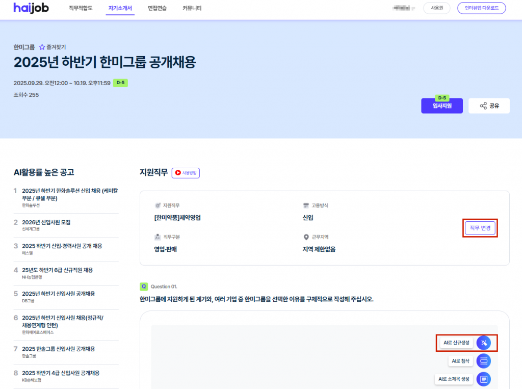 3️⃣'한미그룹 자소서 페이지'에서 지원 직무 선택 후 [AI로 신규 생성] 클릭 (▶한미그룹 자소서 쓰기)