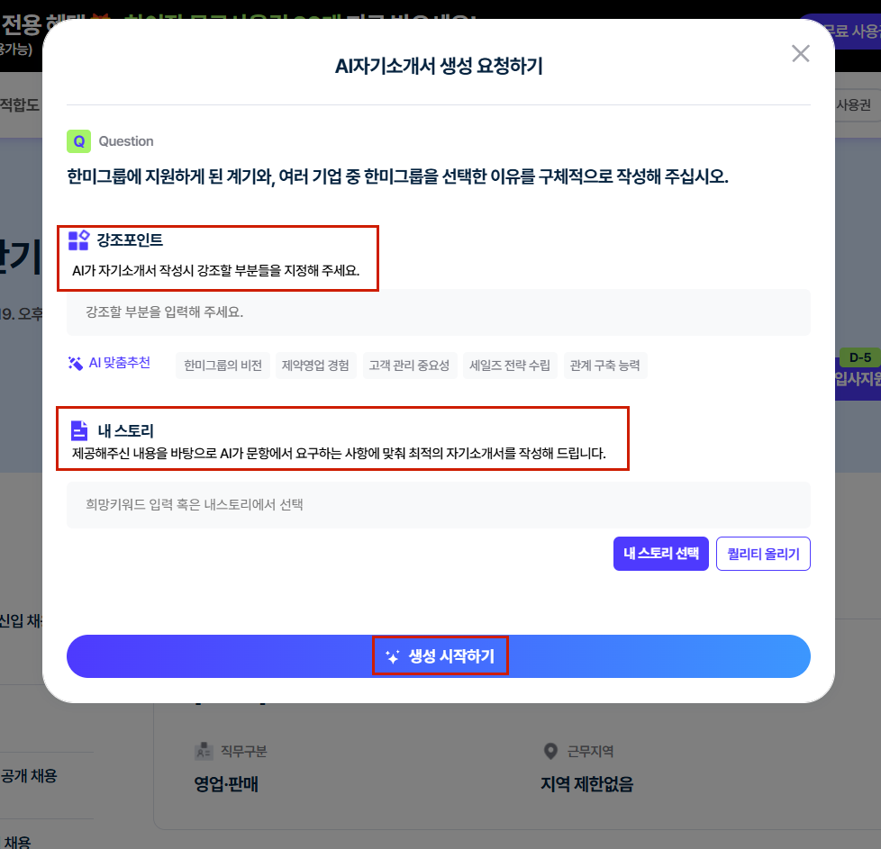 4️⃣강조 포인트와 내 스토리 선택하면, '한미그룹 맞춤 자소서' 완성!🎉 (▶한미그룹 자소서 쓰기)