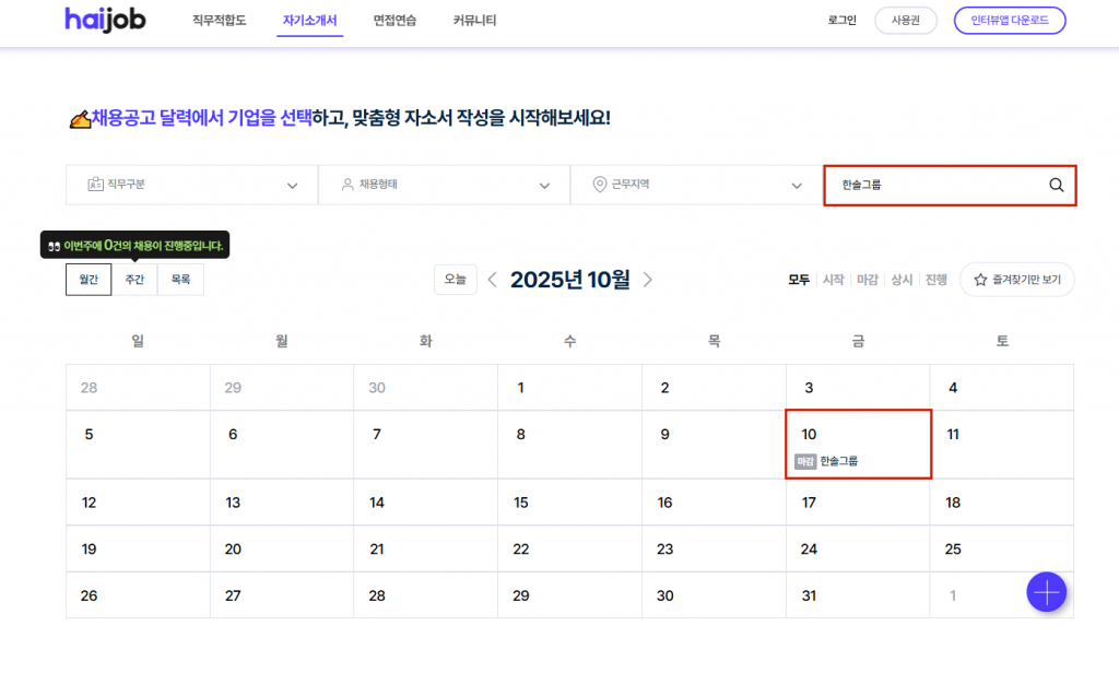 2️⃣'자기소개서 > 실시간 채용공고' 메뉴의 채용공고 달력에서 '한솔그룹(10/10)' 클릭 (▶한솔그룹 자소서 써보기)