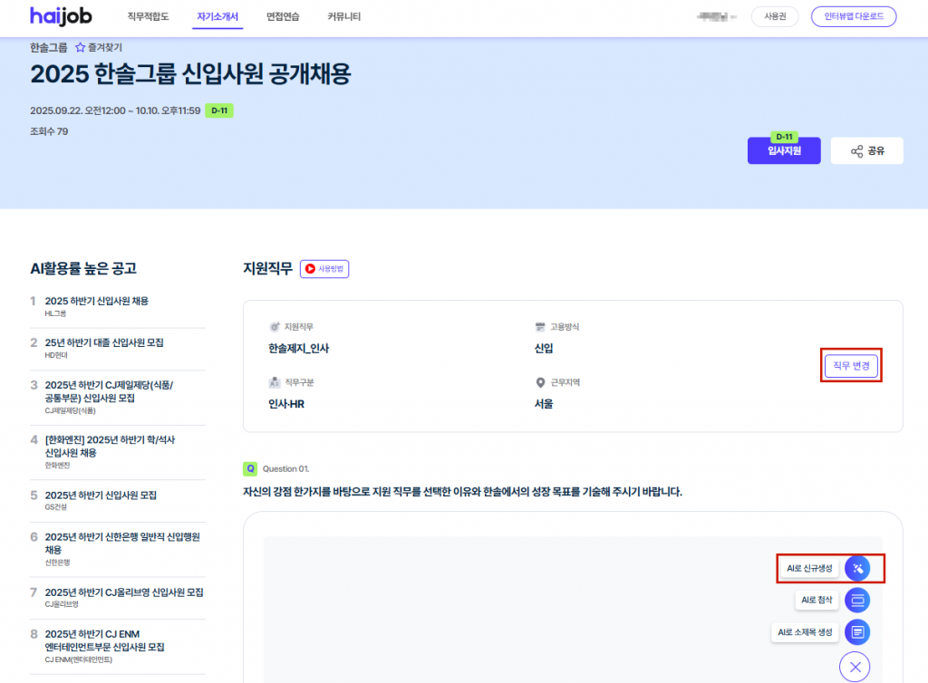 3️⃣'한솔그룹 자소서 페이지'에서 지원 직무 선택 후 [AI로 신규 생성] 클릭 (▶한솔그룹 자소서 써보기)