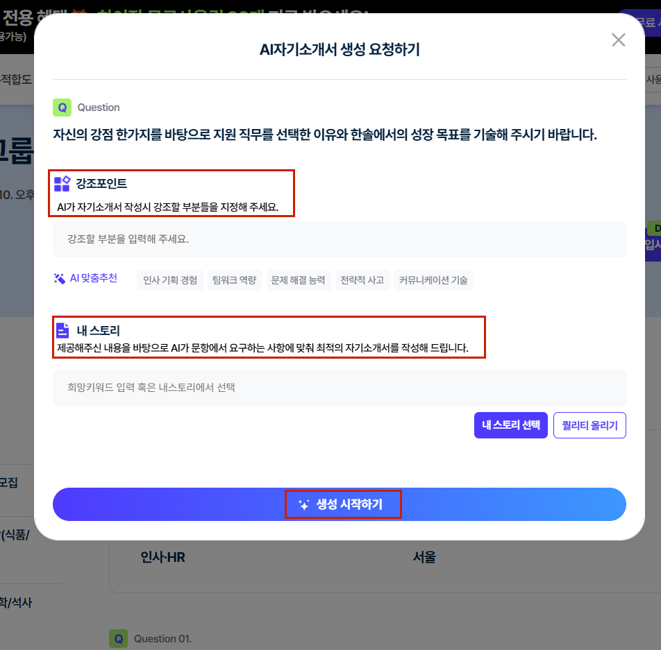 4️⃣강조 포인트와 내 스토리 선택하면, '한솔그룹 맞춤 자소서' 완성! (▶한솔그룹 자소서 써보기)