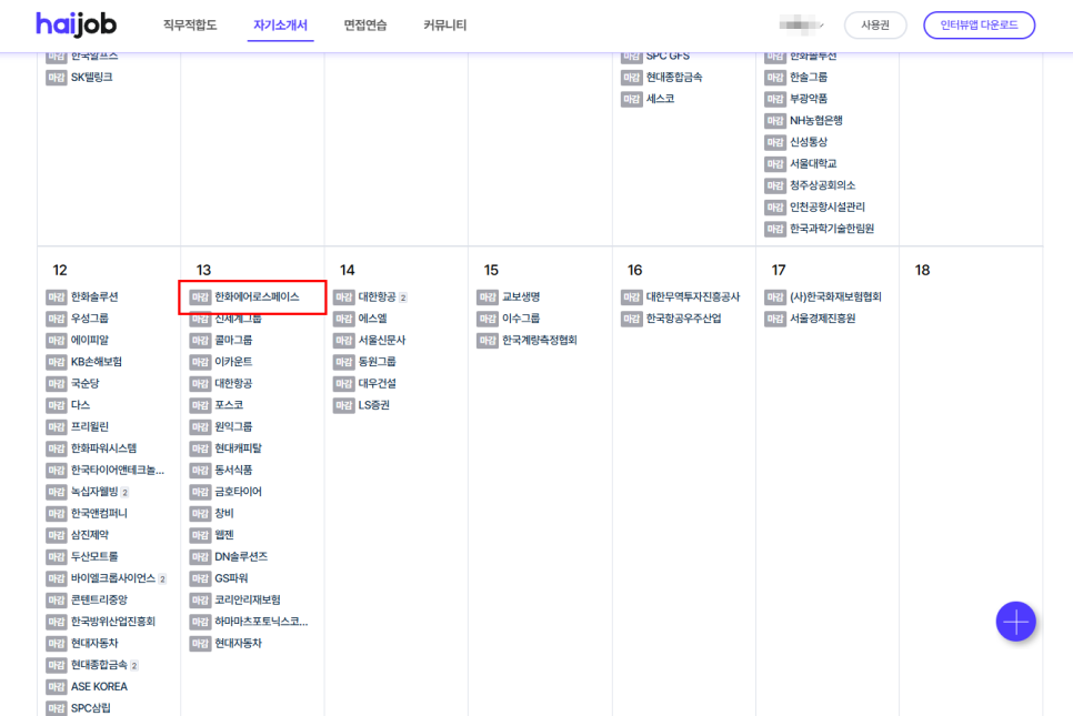 2️⃣'자기소개서 > 실시간 채용공고' 메뉴의 채용공고 달력에서 '한화에어로스페이스(10/13)' 클릭 (▶한화에어로스페이스 자소서 써보기)