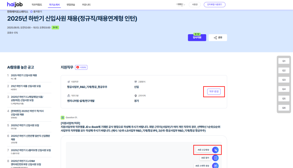 하이잡으로 한화에어로스페이스 자소서 초안을 빠르게 잡고,