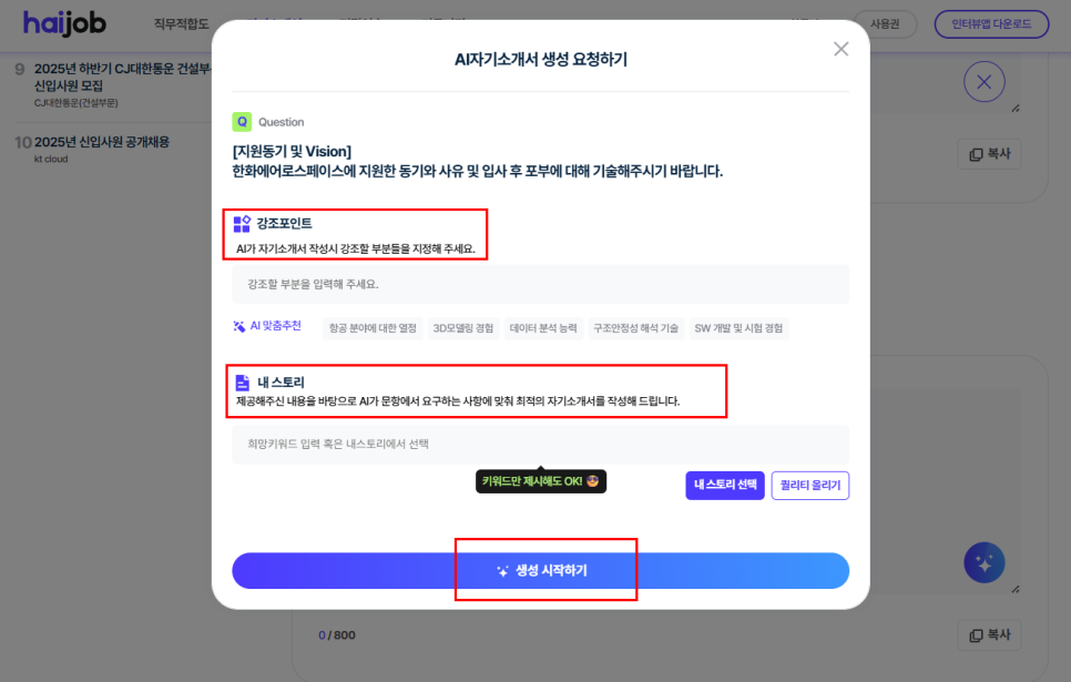 4️⃣강조 포인트와 내 스토리 선택하면, '한화에어로스페이스 맞춤 자소서' 완성!🎉(▶한화에어로스페이스 자소서 써보기)