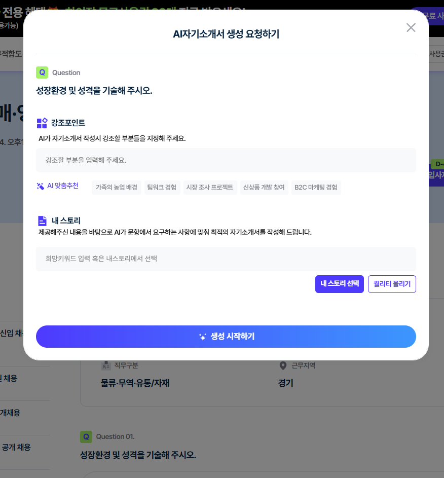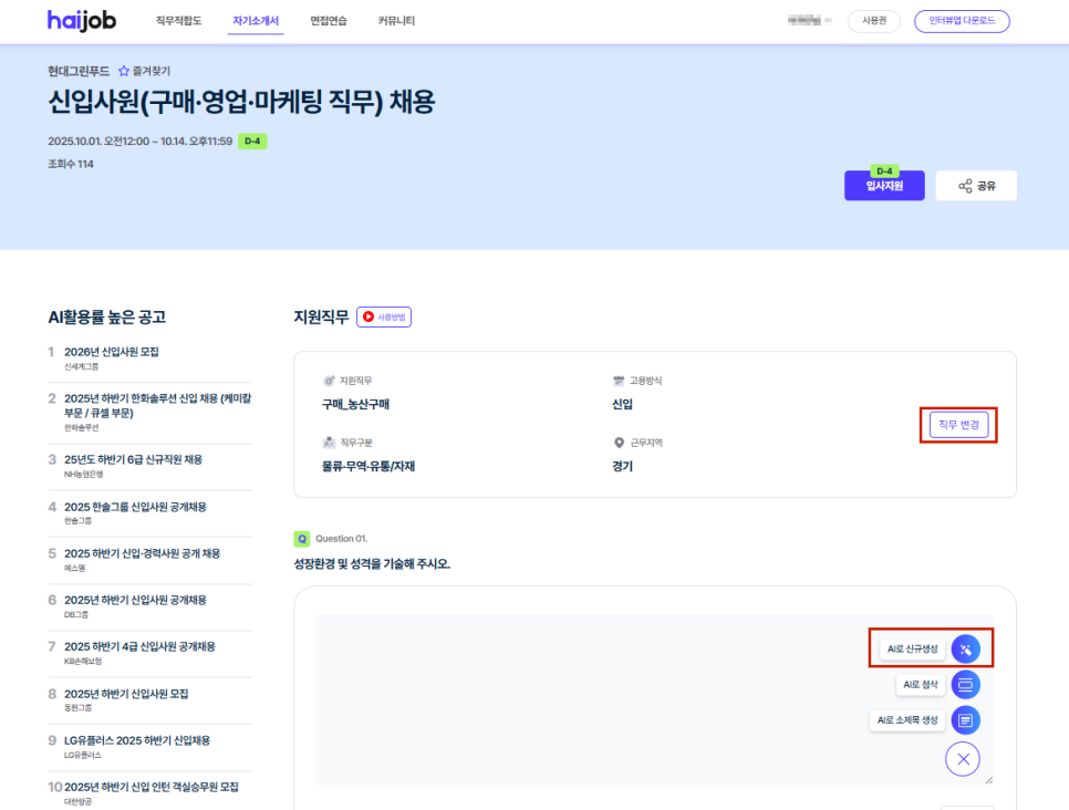 기업/직무, 자소서 항목, 내 경험을 분석해 채용공고 맞춤형 자소서를 생성해주는 AI 자소서·면접 플랫폼 '하이잡(haijob)'을 활용해 보세요!