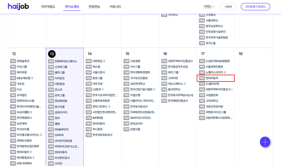 2️⃣'자기소개서 > 실시간 채용공고' 메뉴의 채용공고 달력에서 '현대자동차(10/17)' 클릭 (▶현대자동차 자소서 써보기)