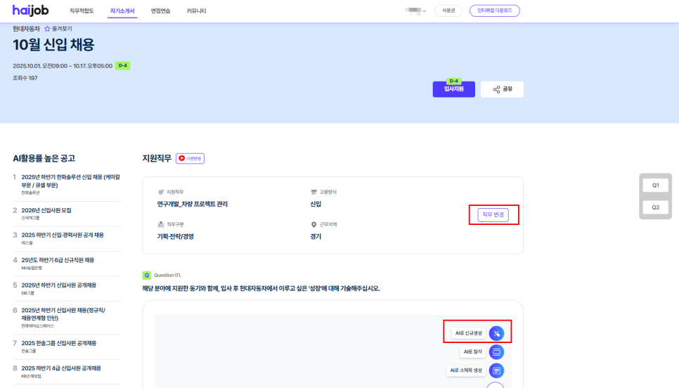 3️⃣'현대자동차 자소서 페이지'에서 지원 직무 선택 후 [AI로 신규 생성] 클릭 (▶현대자동차 자소서 써보기)