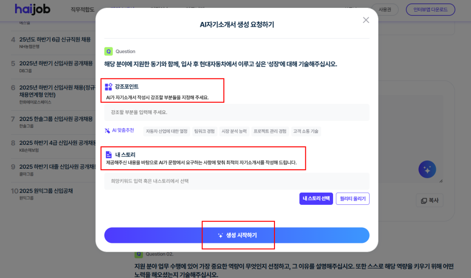 4️⃣강조 포인트와 내 스토리 선택하면, '현대자동차 맞춤 자소서' 완성!🎉 (▶현대자동차 자소서 써보기)