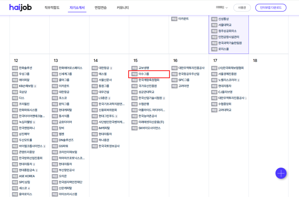 2️⃣'자기소개서 > 실시간 채용공고' 메뉴의 채용공고 달력에서 '이수그룹(10/15)' 클릭 (▶이수그룹 자소서 써보기)