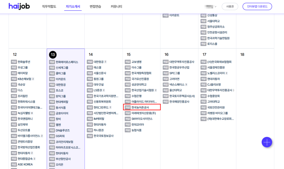 2️⃣'자기소개서 > 실시간 채용공고' 메뉴의 채용공고 달력에서 '한국농어촌공사(10/15)' 클릭 (▶한국농어촌공사 자소서 써보기)