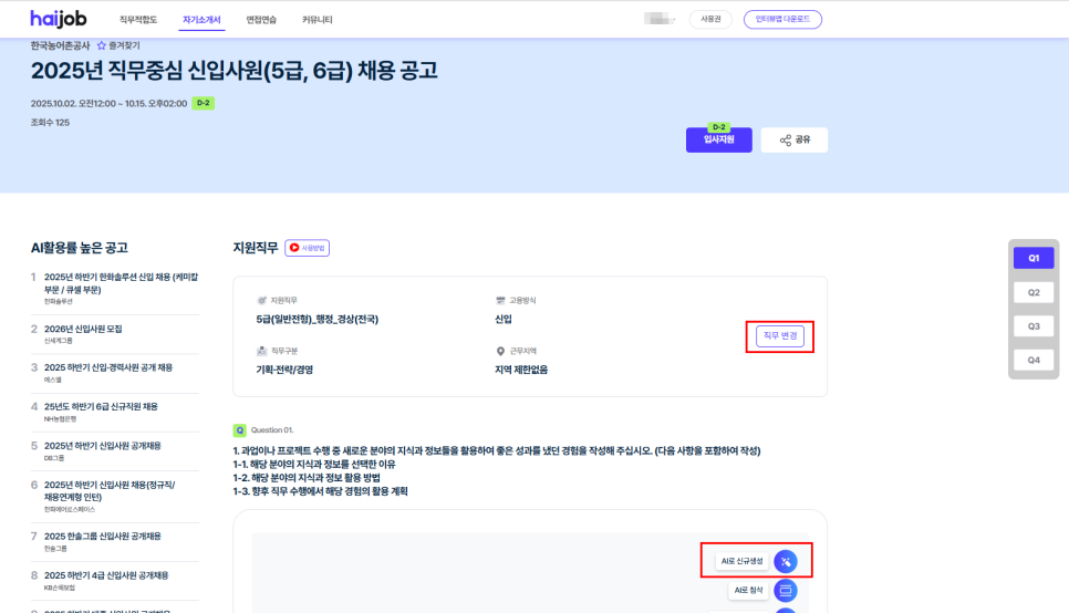 하이잡으로 한국농어촌공사 자소서 초안을 빠르게 잡고,
