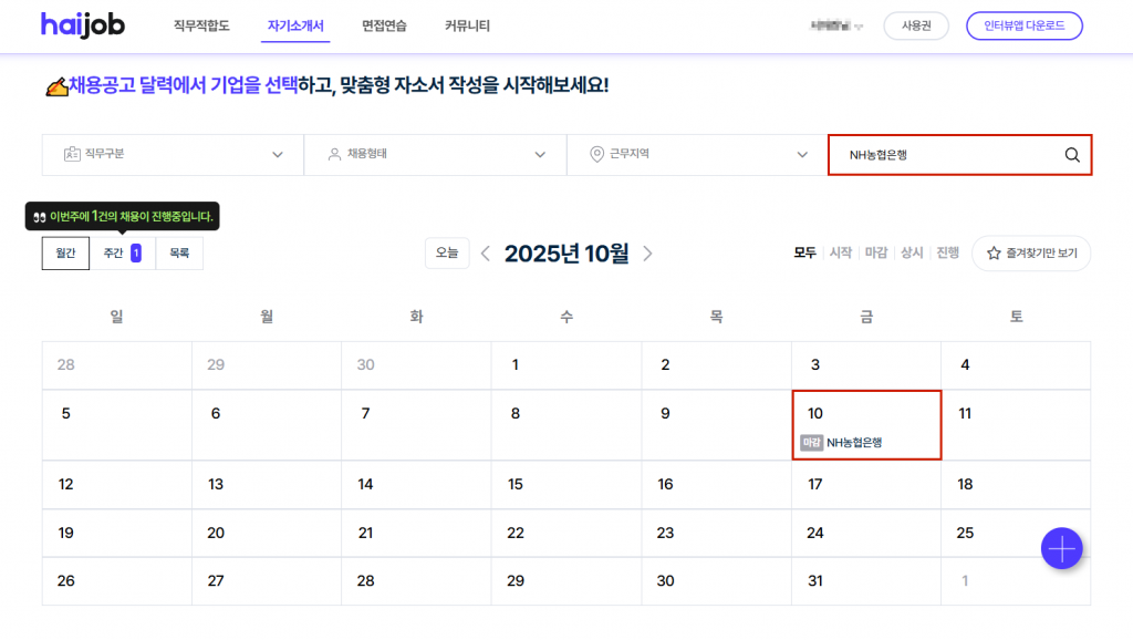 2️⃣'자기소개서 > 실시간 채용공고' 메뉴의 채용공고 달력에서 'NH농협은행(10/10)' 클릭 (▶NH농협은행 자소서 쓰기)