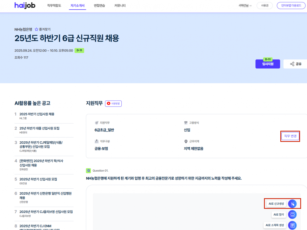 3️⃣'NH농협은행 자소서 페이지'에서 지원 직무 선택 후 [AI로 신규 생성] 클릭 (▶NH농협은행 자소서 쓰기)