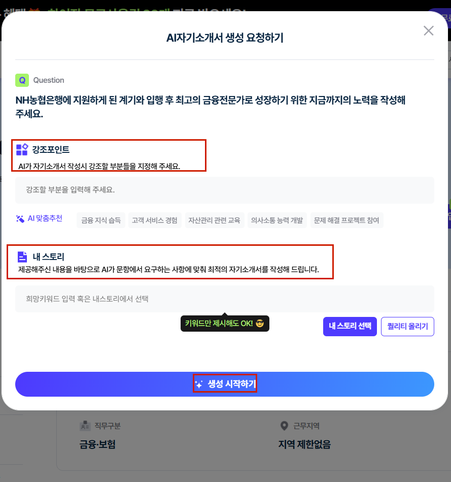 4️⃣강조 포인트와 내 스토리 선택하면, 'NH농협은행 맞춤 자소서' 완성! (▶NH농협은행 자소서 쓰기)