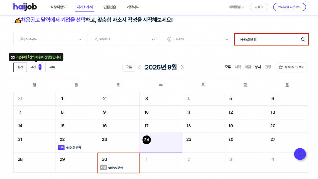 2️⃣ '자기소개서 > 실시간 채용공고' 메뉴의 채용공고 달력에서 'NH농협생명(9/30)' 클릭 (▶NH농협생명 자소서 쓰기)