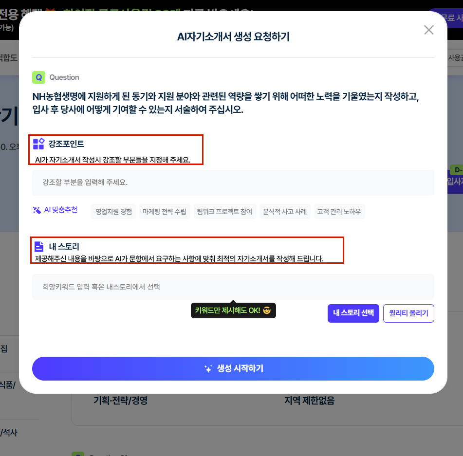 4️⃣강조 포인트와 내 스토리 선택하면, 'NH농협생명 맞춤 자소서' 완성! (▶NH농협생명 자소서 쓰기)