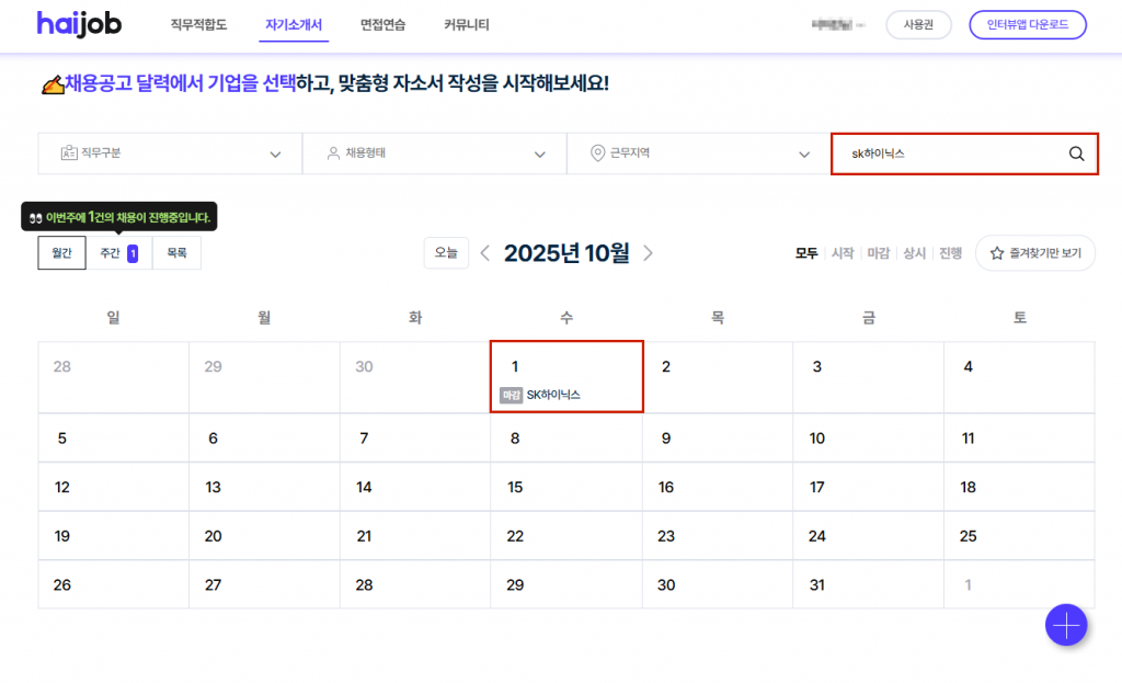 2️⃣'자기소개서 > 실시간 채용공고' 메뉴의 채용공고 달력에서 'SK하이닉스 (10/1)' 클릭 (▶SK하이닉스 자소서 쓰기)