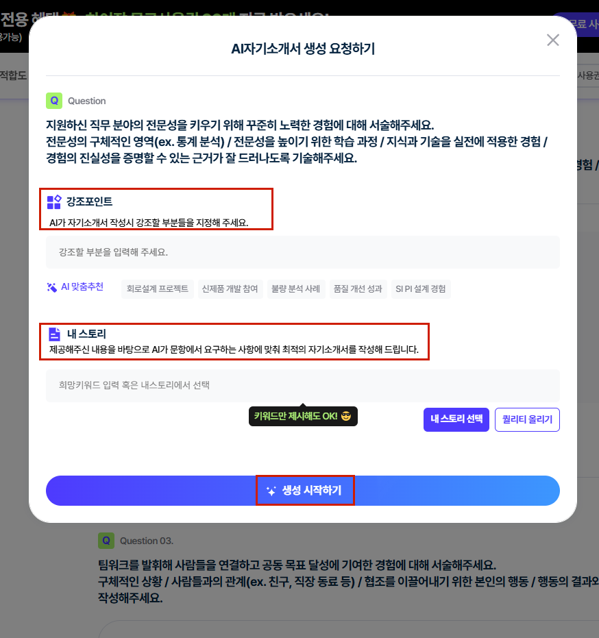 4️⃣강조 포인트와 내 스토리 선택하면, 'SK하이닉스 맞춤 자소서' 완성! (▶SK하이닉스 자소서 쓰기)