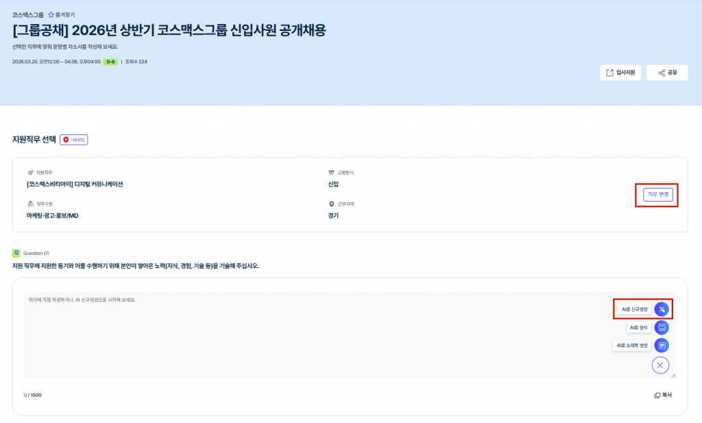3️⃣ '코스맥스그룹 자소서 페이지'에서 지원 직무 선택 후 [AI로 신규 생성] 클릭 ✨