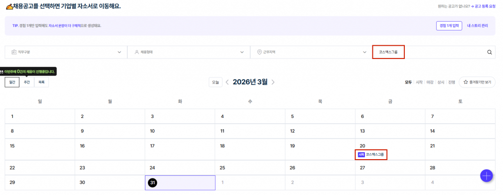 2️⃣ '자기소개서 > 실시간 채용공고' 메뉴의 채용공고 달력에서 '코스맥스그룹 (4/6)' 클릭