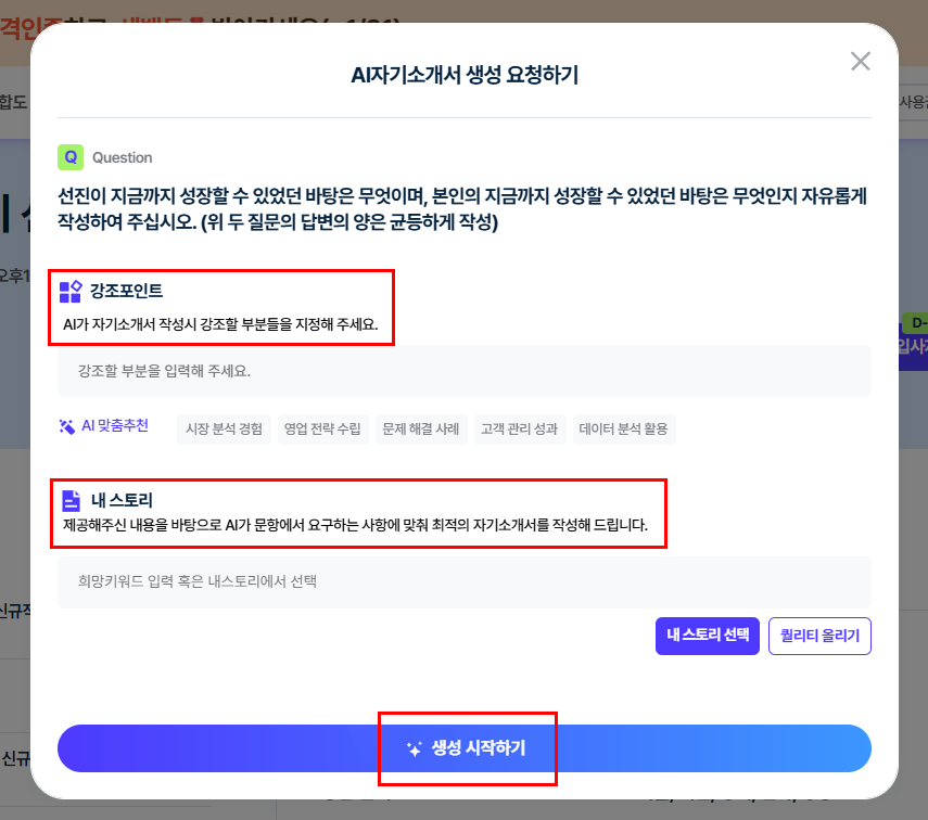 4️⃣ 강조 포인트와 내 스토리 선택하면, '동국씨엠 맞춤형 자소서' 완성!✨ (▶동국씨엠 맞춤형 자소서 쓰기)