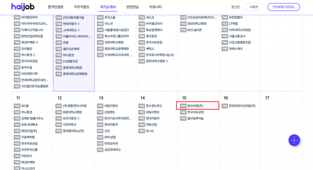 2️⃣ '자기소개서 > 실시간 채용공고' 메뉴의 채용공고 달력에서 '동국씨엠(1/15)' 클릭 (▶동국씨엠 맞춤형 자소서 쓰기)