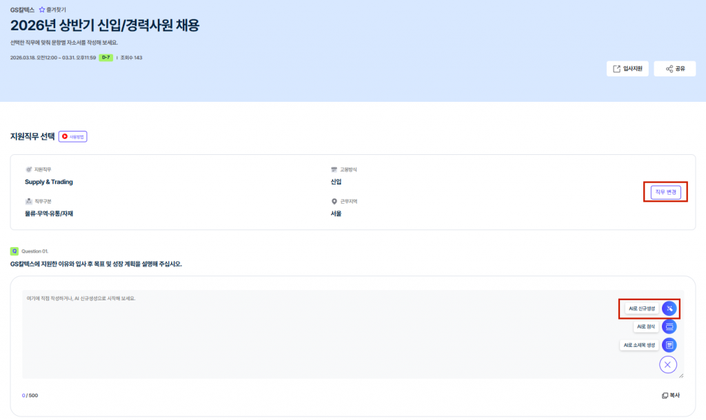 3️⃣ 'GS칼텍스 자소서 페이지'에서 지원 직무 선택 후 [AI로 신규 생성] 클릭 ✨