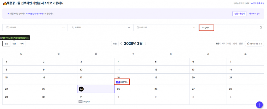 2️⃣ '자기소개서 > 실시간 채용공고' 메뉴의 채용공고 달력에서 'GS칼텍스 (3/31)' 클릭