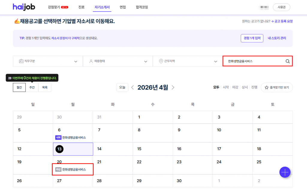 2️⃣ '자기소개서 > 실시간 채용공고' 메뉴의 채용공고 달력에서 '한화생명금융서비스 (4/20 마감)' 클릭