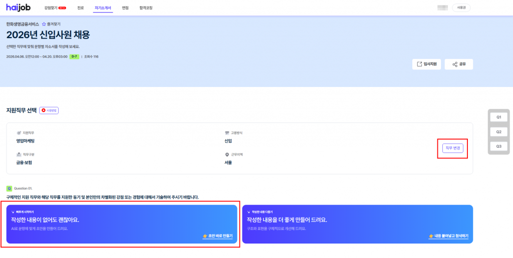 하이잡으로 한화생명금융서비스 자소서 초안을 빠르게 잡고,