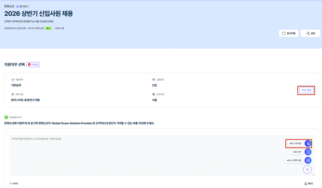 3️⃣ '한화오션 자소서 페이지'에서 지원 직무 선택 후 [AI로 신규 생성] 클릭 ✨