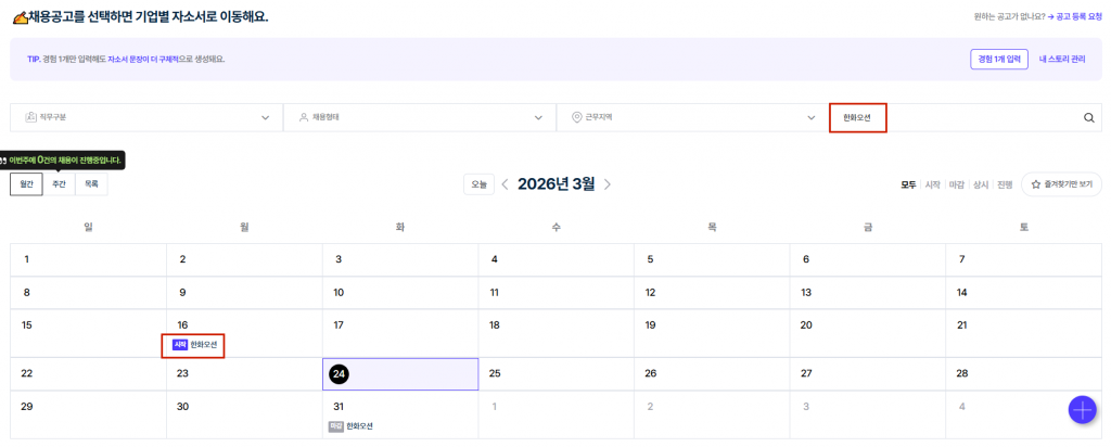 2️⃣ '자기소개서 > 실시간 채용공고' 메뉴의 채용공고 달력에서 '한화오션 (3/31)' 클릭