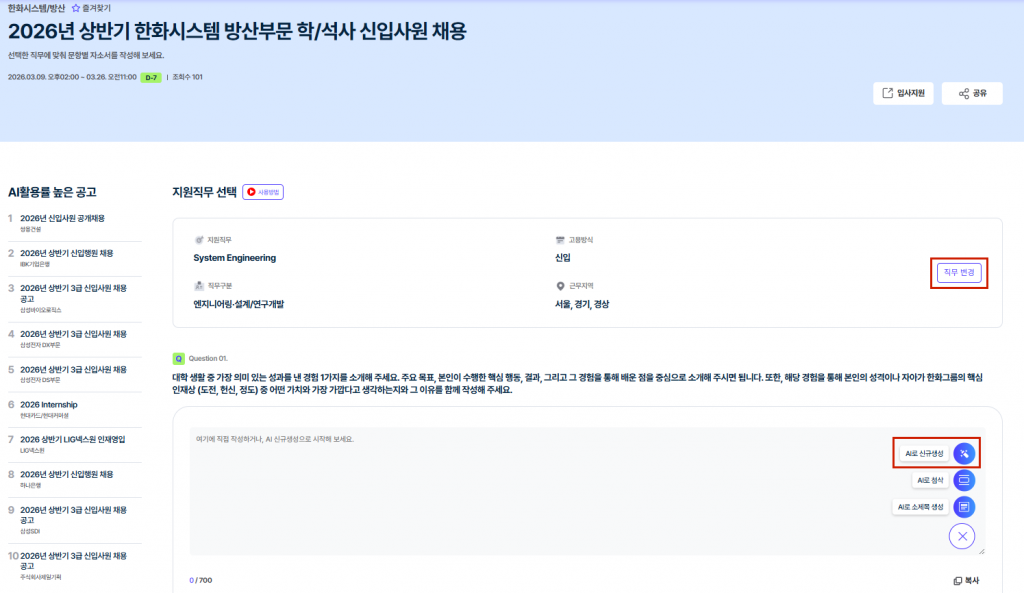 한화시스템 방산부문 자소서 생성_2 채용공고 선택