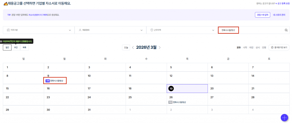 2️⃣ '자기소개서 > 실시간 채용공고' 메뉴의 채용공고 달력에서 '한화시스템 방산부문 (3/26)' 클릭