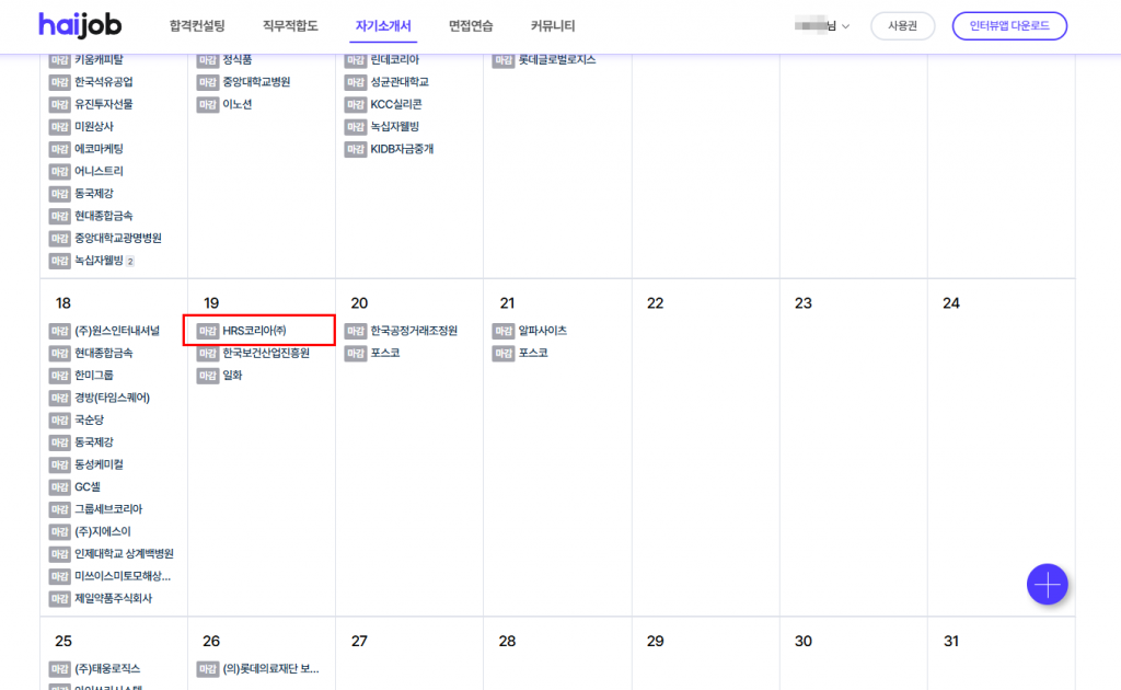 2️⃣ '자기소개서 > 실시간 채용공고' 메뉴의 채용공고 달력에서 'HRS코리아(1/19)' 클릭 (▶HRS코리아 맞춤 자소서 써보기)