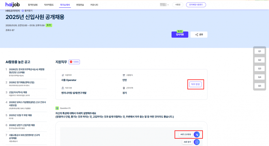 3️⃣ 'HRS코리아 자소서 페이지'에서 지원직무 선택 후 [AI로 신규 생성] 클릭 (▶HRS코리아 맞춤 자소서 써보기)