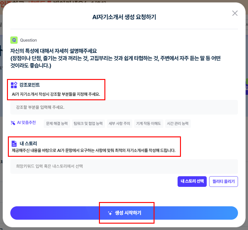 4️⃣ 강조 포인트와 내 스토리 선택하면, 'HRS코리아 맞춤형 자소서' 완성!✨ (▶HRS코리아 맞춤 자소서 써보기)