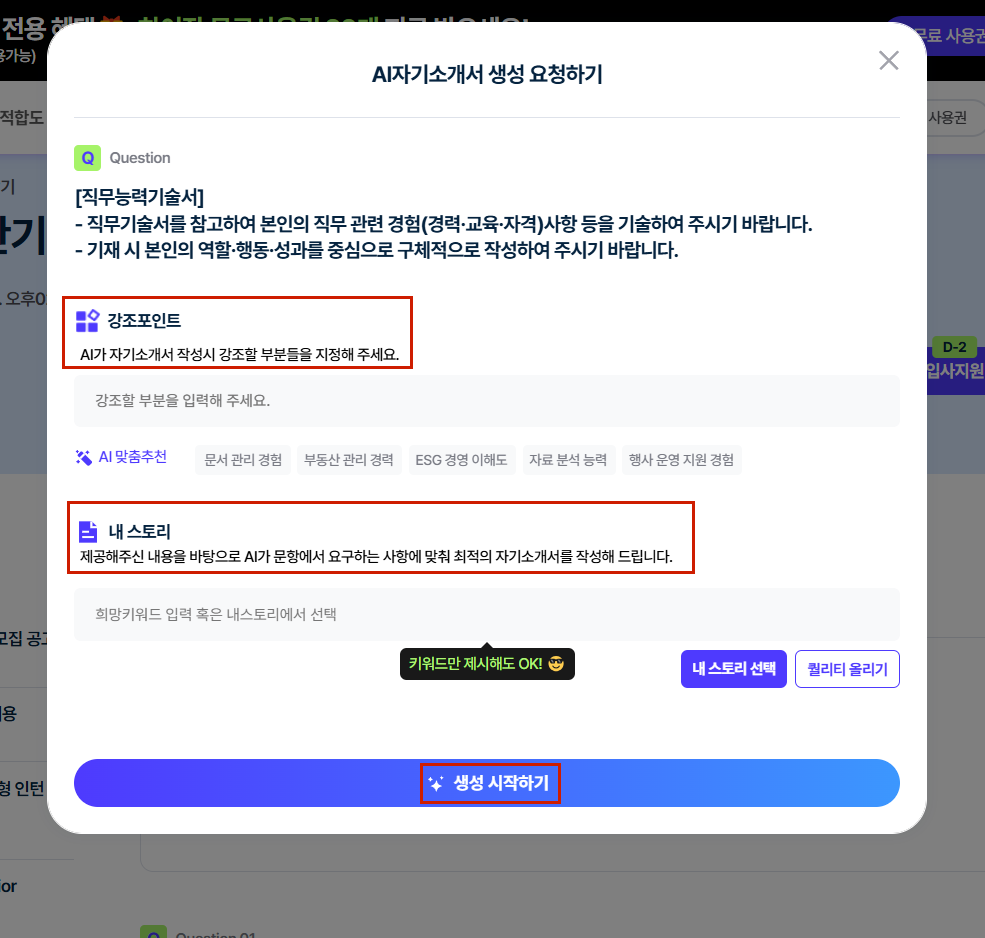 4️⃣강조 포인트와 내 스토리 선택하면, '주택도시보증공사 맞춤 자소서' 완성!✨ (▶주택도시보증공사 자소서 쓰기)