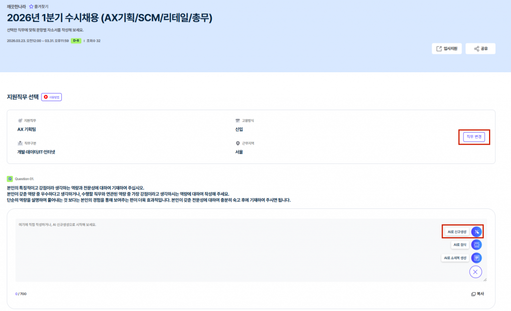 3️⃣ '깨끗한나라 자소서 페이지'에서 지원 직무 선택 후 [AI로 신규 생성] 클릭 ✨