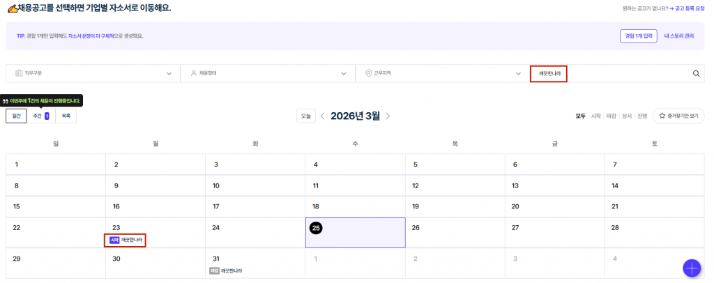 2️⃣ '자기소개서 > 실시간 채용공고' 메뉴의 채용공고 달력에서 '깨끗한나라 (3/31)' 클릭