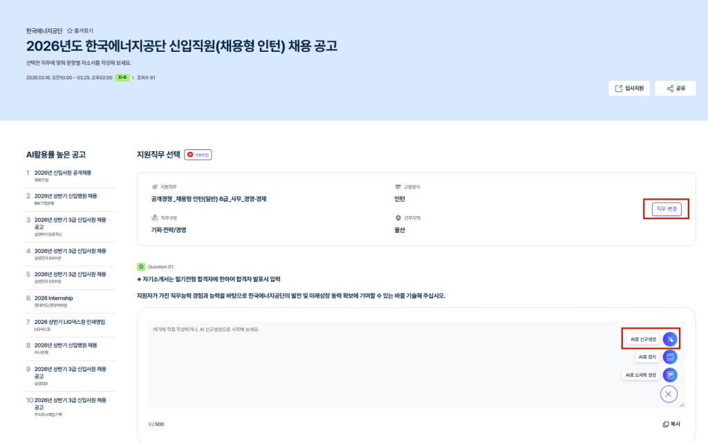 3️⃣ '한국에너지공단 자소서 페이지'에서 지원 직무 선택 후 [AI로 신규 생성] 클릭 ✨