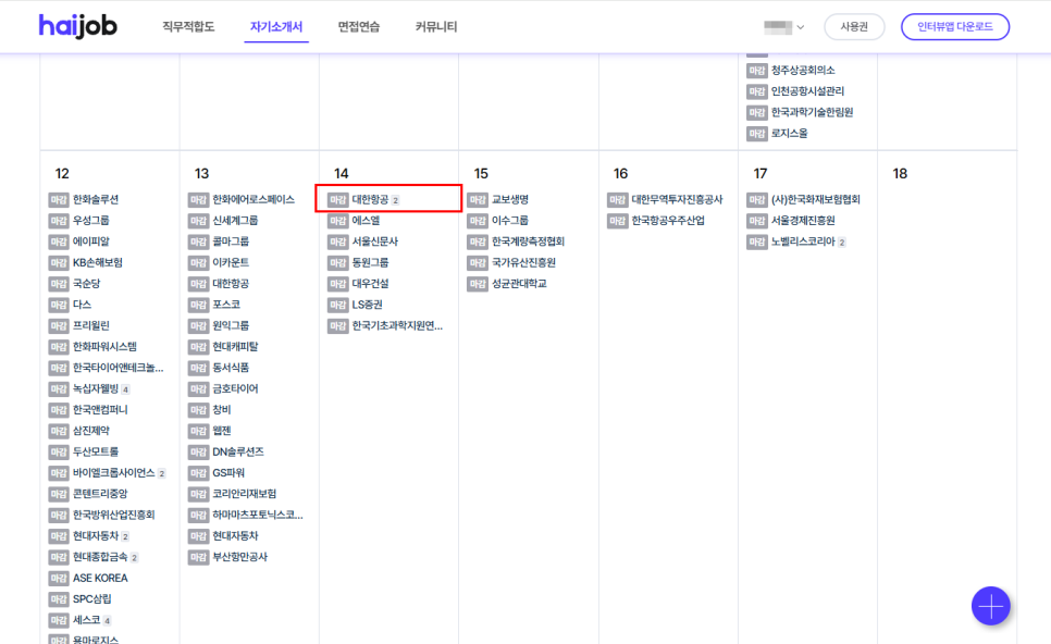 2️⃣'자기소개서 > 실시간 채용공고' 메뉴의 채용공고 달력에서 '대한항공(10/14)' 클릭 (▶대한항공 자소서 써보기)