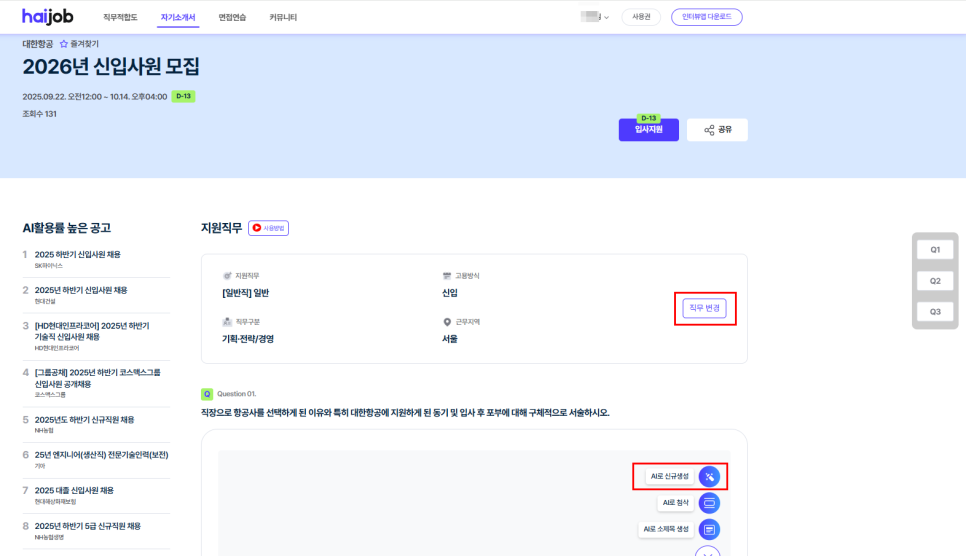 하이잡으로 대한항공 자소서 초안을 빠르게 잡고,
