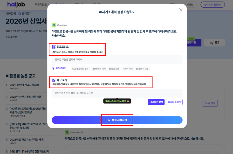 4️⃣강조 포인트와 내 스토리 선택하면, '대한항공 맞춤 자소서' 완성!🎉 (▶대한항공 자소서 써보기)